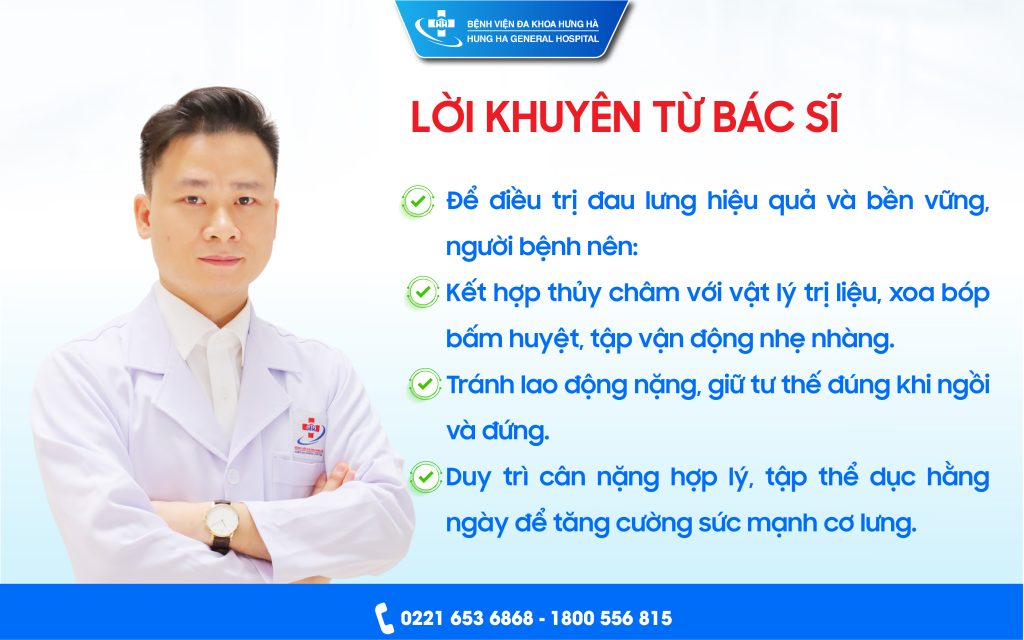 Nếu bạn đang gặp tình trạng đau lưng kéo dài, hãy đến Bệnh viện Đa khoa Hưng Hà để được bác sĩ chuyên khoa Y học cổ truyền thăm khám và điều trị bằng phương pháp thủy châm an toàn, hiệu quả.